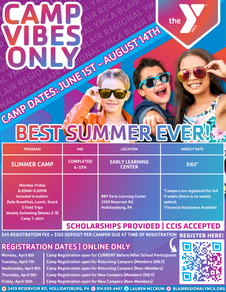 Give your children a life-changing summer experience! Since 1947, the Blair Regional YMCA camps have inspired kids with countless opportunities to laugh, lead, and make lasting friendships. Our age-based camps provide children in Kindergarten-5th grade the opportunity to empower themselves, develop new skills, and gain confidence through educational field trips, workshops, and more. Your child will have a positive, healthy, fun-filled summer with the various safe and enriching activities provided through our camp program. We provide memorable experiences and opportunities to all children through play and exploration in games, arts, swimming, field trips, and more! Our licensed programs and trained counselors deliver meaningful and memorable camp experiences that keep families coming back year after year after year!