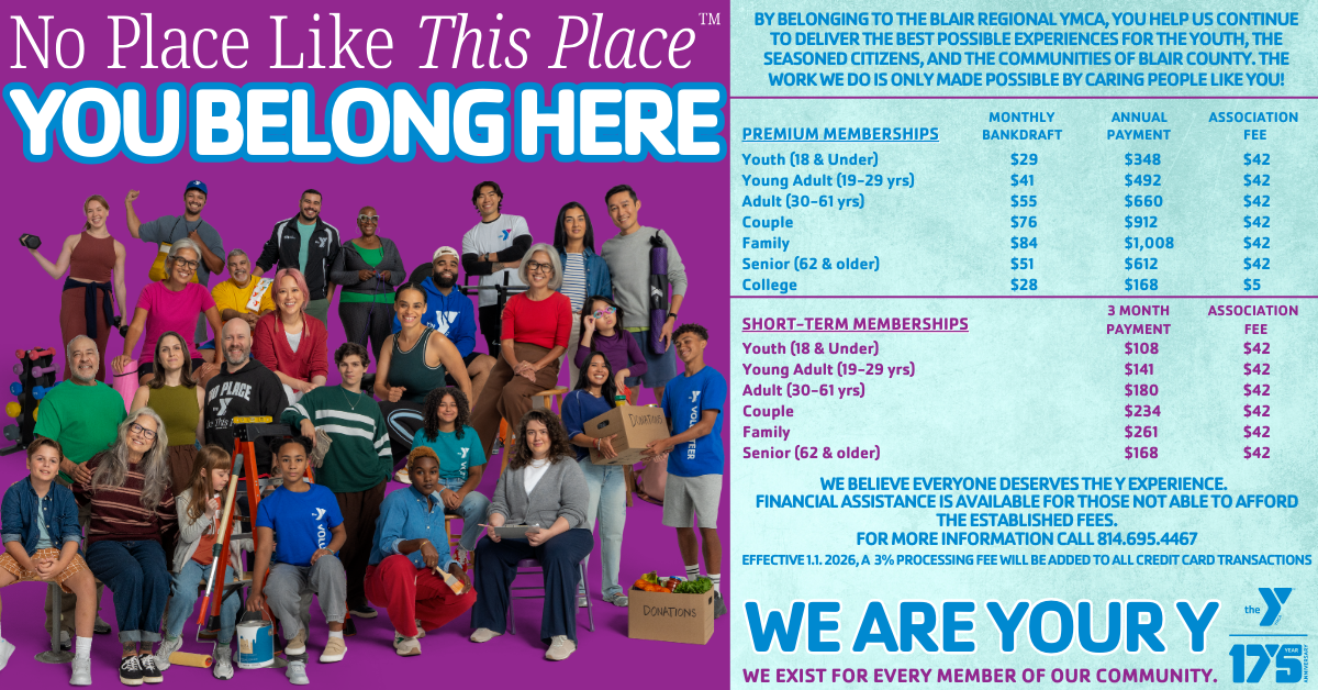 Driven by our founding mission, BLAIR REGIONAL YMCA has served as a leading nonprofit committed to strengthening community for more than 155 years. The Y empowers everyone, no matter who you are or where you’re from, by ensuring access to resources, relationships, and opportunities. We welcome all to learn, grow, and thrive. Our Y members improve overall health and well-being, ignite youth empowerment, and make important connections within the Blair County, PA community – and across more than 10,000 communities nationwide.